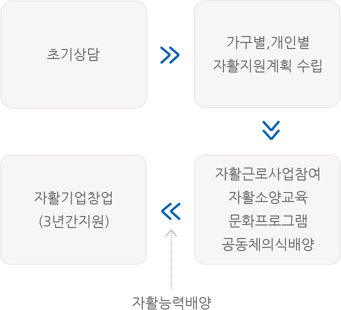 자활사업을 통해 근로능력이 있는 저소득주민이 자활할 수 있는 능력을 높일 수 있도록 기술습득을 지원하고, 사업단 운영을 통해 근로 및 취・창업의 기회를 제공합니다.